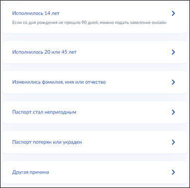 При получение/ замены паспорта по следующим основаниям, необходимо выбрать удобное подразделение МВД для оформления паспорта и подать заявление лично: