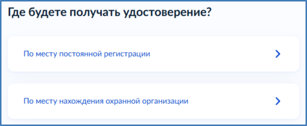 При выборе варианта "По месту нахождения охранной организации" необходимо указать место работы, адрес и должность, а также выбрать подразделение ведомства.