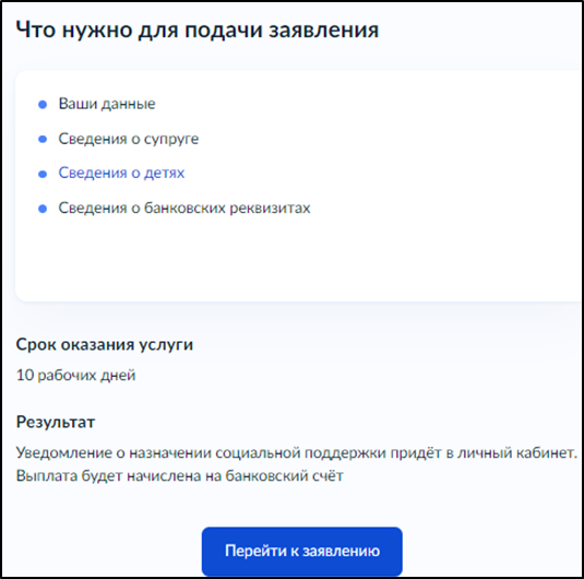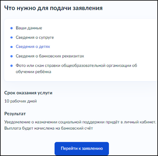 Ознакомьтесь, с тем, что нужно для подачи заявления (данные могут отличаться, в зависимости от вашей ситуации) и нажмите "Перейти к заявлению"