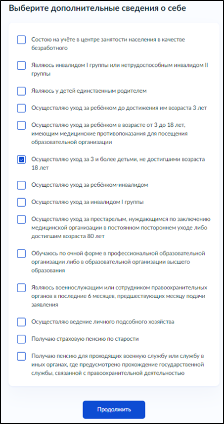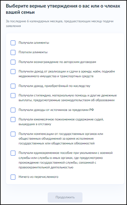 В зависимости от вашего семейного положения, ответьте дополнительно на вопросы системы. После этого выберите верные утверждения о вас и о членах вашей семьи и нажмите "Продолжить":