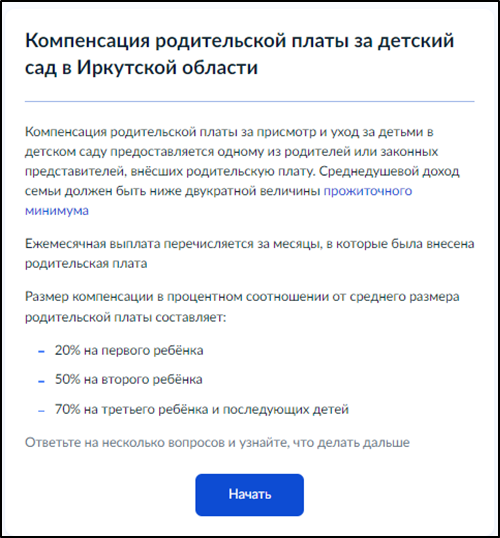 Выберите из предложенных вариантов "Компенсация родительской платы за детский сад в Иркутской области".