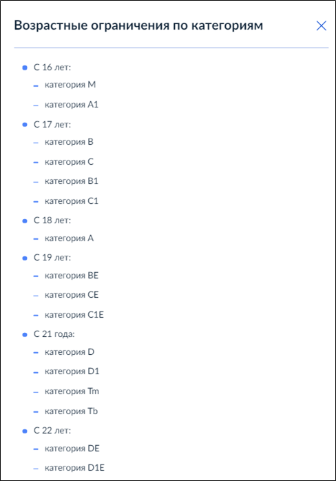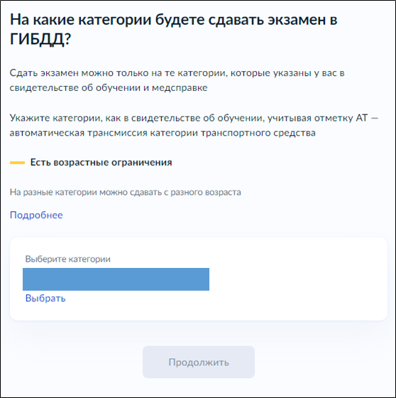 Указать те категории, которые указаны в свидетельстве об обучении и медицинской справке, нажав на кнопку "Выбрать":