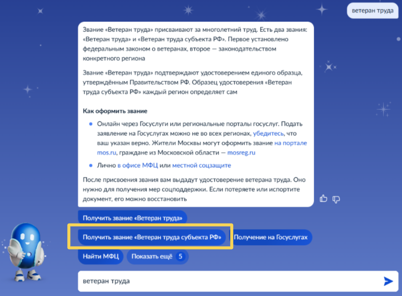 введите запрос Роботу Максу: "Ветеран труда"