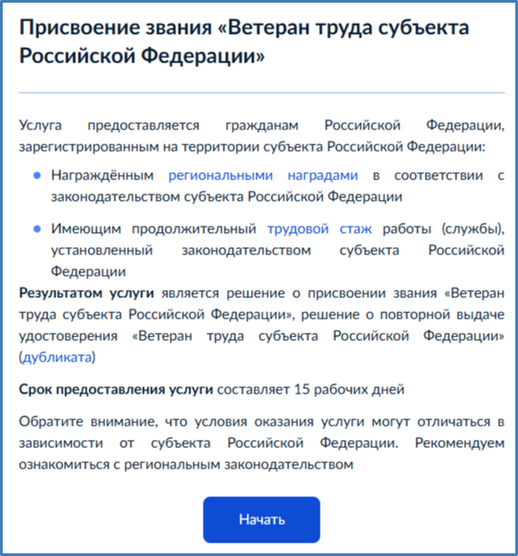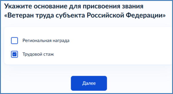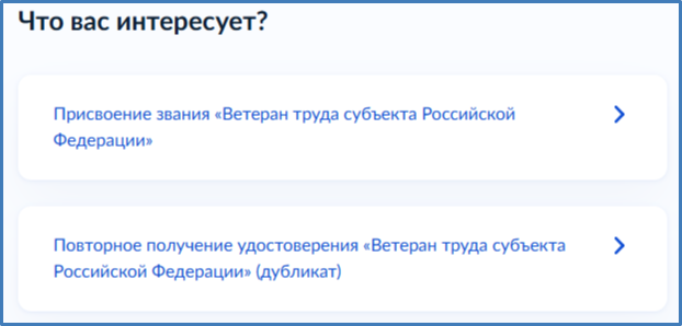 При первичном обращении - выбрать присвоение звания "Ветеран труда субъекта Российской Федерации"