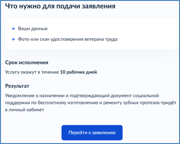 Результат - Уведомление о назначении и подтверждающий документ социальной поддержки по бесплатному изготовлению и ремонту зубных протезов придёт в личный кабинет портала Госуслуг.