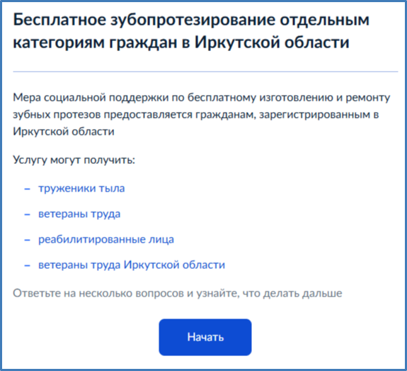 Далее Максом, будет предложена услуга, которую необходимо выбрать "Бесплатное зубопротезирование отдельным категориям граждан в Иркутской области"