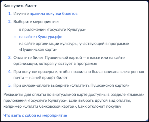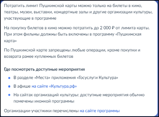 Дополнительную информацию по Пушкинской карте можно получить на портале Госуслуг, введя в поисковой строке "Пушкинская карта"