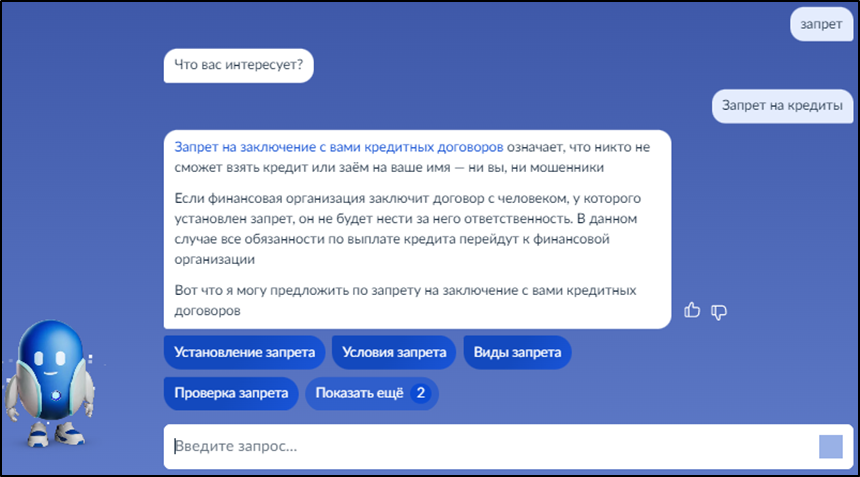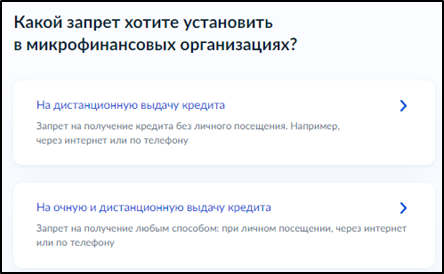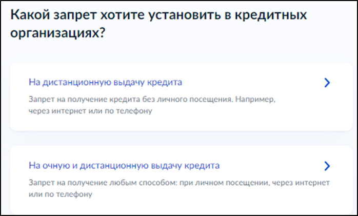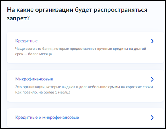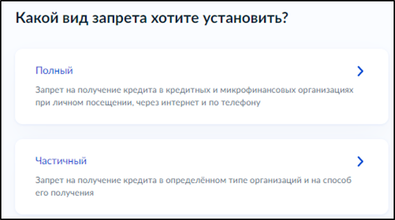 Далее выберите "Запрет на кредиты" и "Установление запрета"