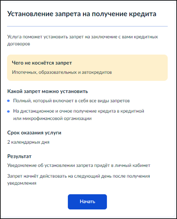 Результат - Уведомление об установлении запрета придут от 4 КБКИ (квалифицированных бюро кредитных историй) в личный кабинет портала Госуслуг. Запрет начнёт действовать на следующий день после получения первого уведомления.