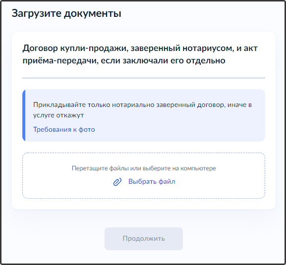 16. Загрузите документы Договор купли-продажи, заверенный нотариусом, и акт приёма-передачи, если заключали его отдельно
