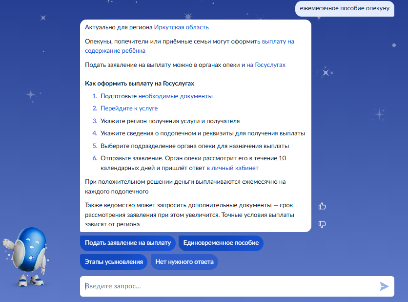 введите запрос Роботу Максу: "ежемесячное пособие опекуну"