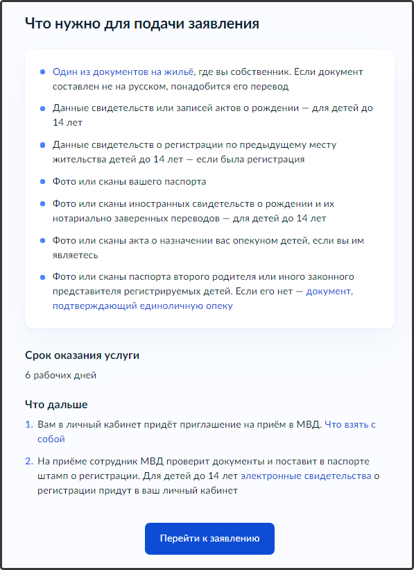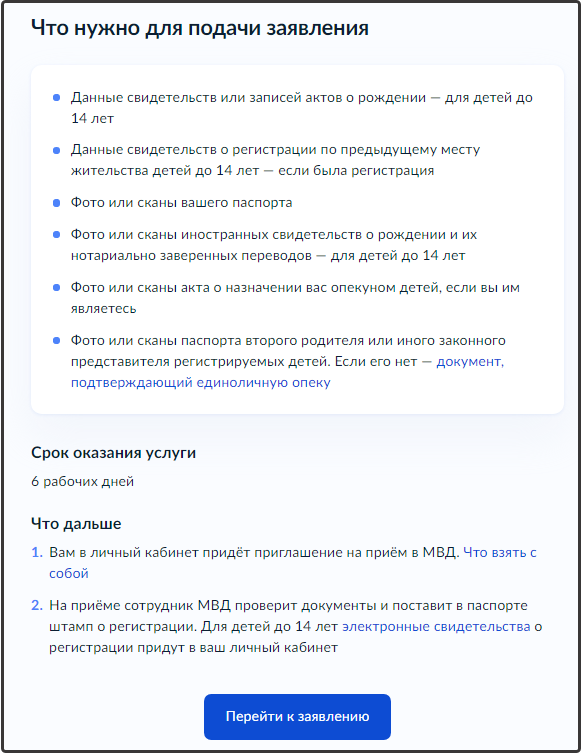 - На приёме сотрудник МВД проверит документы и поставит в паспорте штамп о регистрации. Для детей до 14 лет электронные свидетельства о регистрации придут в ваш личный кабинет