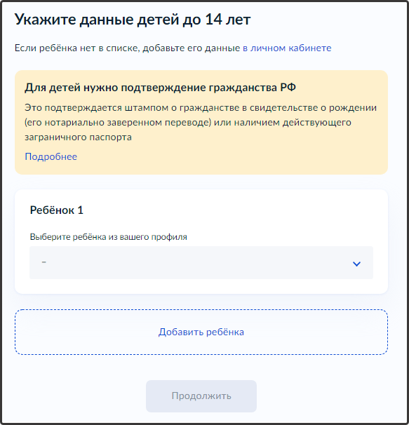 Для детей нужно подтверждение гражданства РФ. Это подтверждается штампом о гражданстве в свидетельстве о рождении (его нотариально заверенном переводе) или наличием действующего заграничного паспорта.