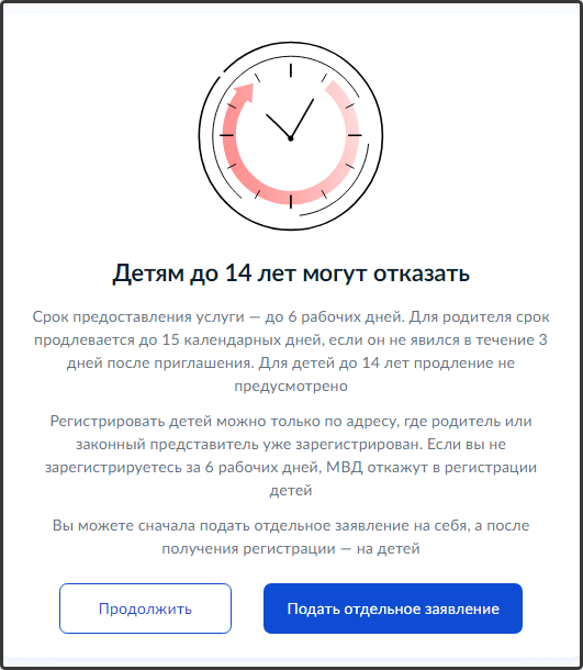 Срок предоставления услуги — до 6 рабочих дней. Для родителя срок продлевается до 15 календарных дней, если он не явился в течение 3 дней после приглашения. Для детей до 14 лет продление не предусмотрено