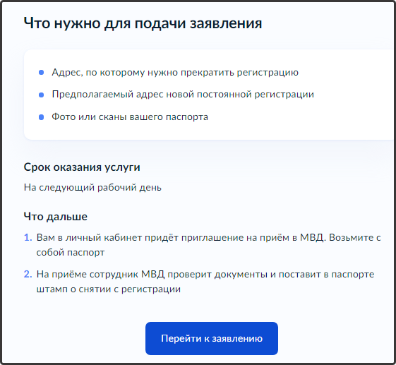 Результат - снятие регистрации по месту жительства (штамп в паспорте). Вам в личный кабинет придёт приглашение на приём в МВД. На приёме сотрудник МВД проверит ваши документы и поставит в паспорте штамп о снятии с регистрации.